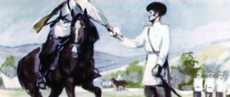 Прошел еще один месяц в плену. Жилин тайком уже подкоп из сарая наружу вырыл. Осталось разузнать дорогу к своим. Уговорил он малого (парнишку), которого хозяин к нему приставил, выйти на горы посмотреть. И понял, в какой стороне его крепость. И вроде как дымок над ней разглядел. В ту же ночь бежать не удалось.